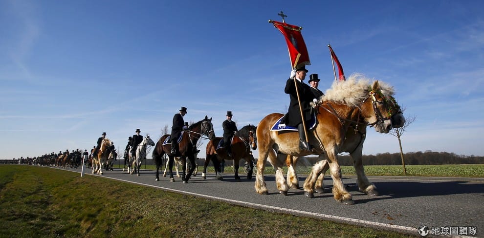 德國少數民族索布人(Sorb)騎著馬,參加遊行。復活節這天,超過 1,000名騎士騎馬參加遊行,慶祝耶穌基督的復活。