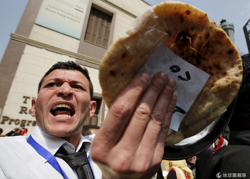 埃及議會前面出現示威活動,一名男人拿著麵包要求埃及政府提供公職機會給失業的畢業生,讓他們當公務員。根據報導,抗議民眾大多有碩、博士學位,但他們表示自己現在處於失業,或是做著跟教育水準不符的工作。