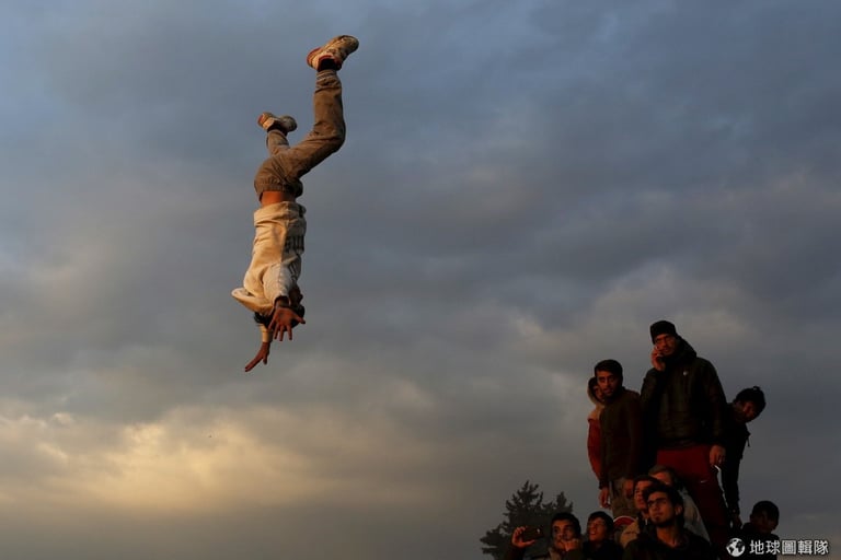 希臘靠近馬其頓邊界的一個臨時難民營,難民們正在唱歌跳舞同樂。