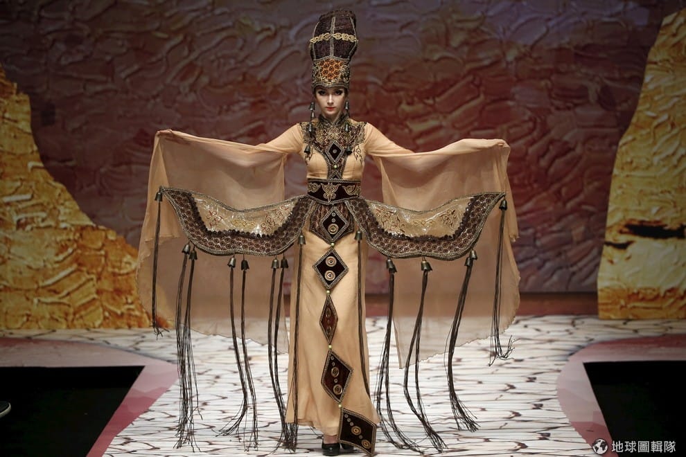 一名模特兒在中國時尚周上,展示設計師陶陶的作品。