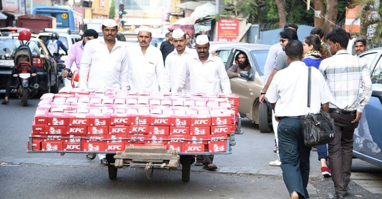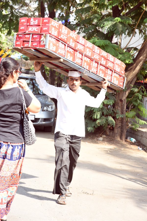 人來人往的孟買(Mumbai)大街上可以看見白帽白衣的便當外送員「達巴瓦拉」(dabbawala)推著堆得像座山的肯德基餐盒穿梭人群中。
