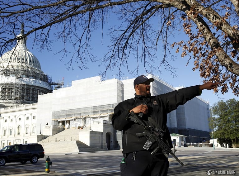 一名美警在國會山莊外指揮,現場因為有槍手威脅遊客中心而一團混亂。