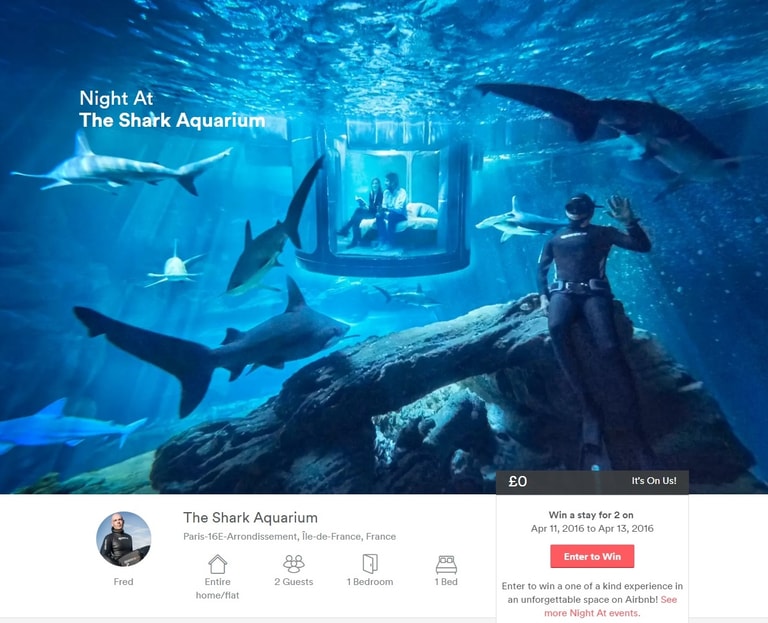 這特別的住宿活動,世界各地的人都有機會參加,贏家將能攜帶一位同伴免費飛往巴黎並入住水族館。