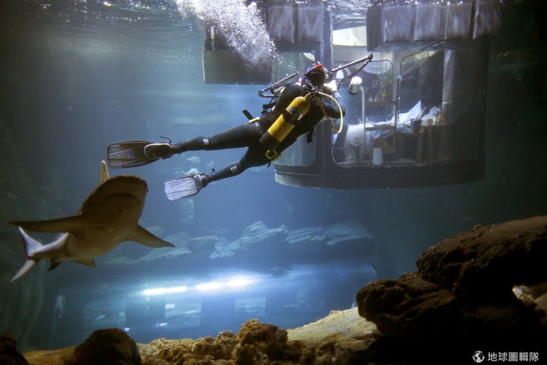 會說「寧靜卻又刺激」的原因無他,因為巴黎水族館準備好給贏家的「客房」不是在地面上而是水底下,贏家將有三天兩夜住在水面下 10公尺深的玻璃屋中,更棒的是,從屋內向外望時,會發現 35隻鯊魚在四周悠游。