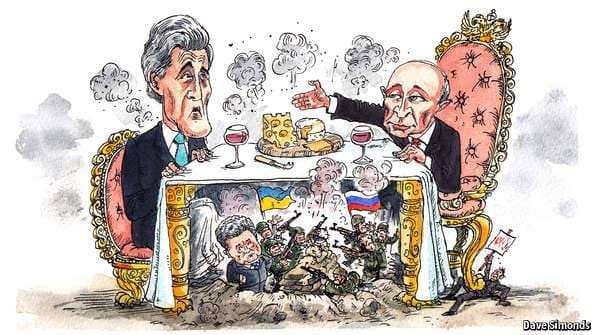 路透社雖然俄國和烏克蘭在去年 2月簽訂了明斯克停火協議,但台面下仍衝突不斷。圖中可以看到美國國務卿凱瑞(左)和俄國總統普亭(右),桌下則有烏克蘭總統波洛申科(左下)。