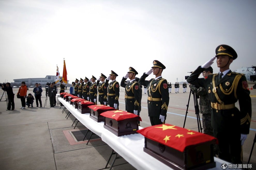 南韓的仁川機場,中國儀隊向著裝有軍人遺骨的盒子敬禮。根據報導,36名死於韓戰的中國軍人即將在 31號回到中國永久埋葬。1950-1953年的韓戰,北韓和南韓互相交戰,當時的中國共產黨協助北韓打仗,據信有數千名中國軍人死於韓戰中。到了現代,南韓基於人道立場,陸續歸還中國軍人的遺骨。
