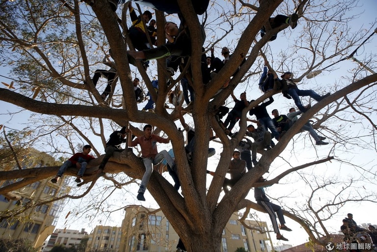巴勒斯坦人們爬到樹上,觀賞市政府舉辦的文化嘉年華。