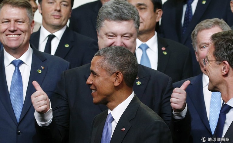 烏克蘭總統波洛申科(Petro Poroshenko)豎起兩隻大拇指,美國總統歐巴馬(前排中央,Barack Obama)正從他面前經過,準備要拍核安全峰會(Nuclear Security Summit)的大合照。根據《維基百科》,核安全峰會的目的是要防止核恐怖主義擴散、裁減核武、加強各國間核安全等國際合作,今年的峰會在美國華盛頓舉辦,是第 4次峰會。
