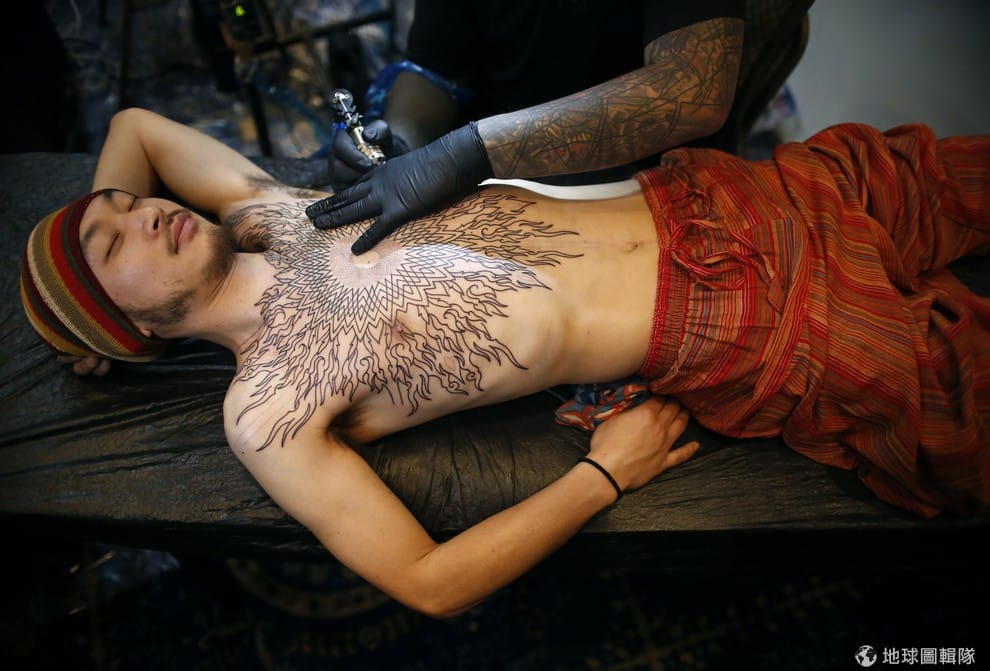一名男人「尼泊爾刺青大會」(Nepal Tattoo Convention)上給師傅刺青。