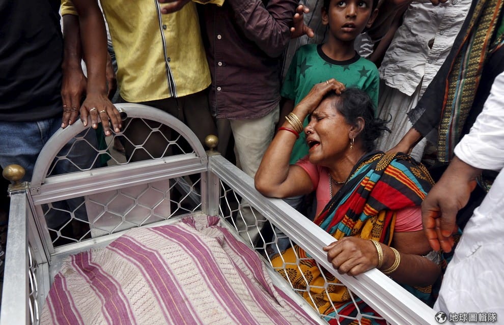 一名女人靠在蘭薩尼(Mohammad Ramzani)的遺體旁邊痛哭。蘭薩尼是一名人力車司機,周四(31)時因為一座建造中的橋倒塌而死亡。