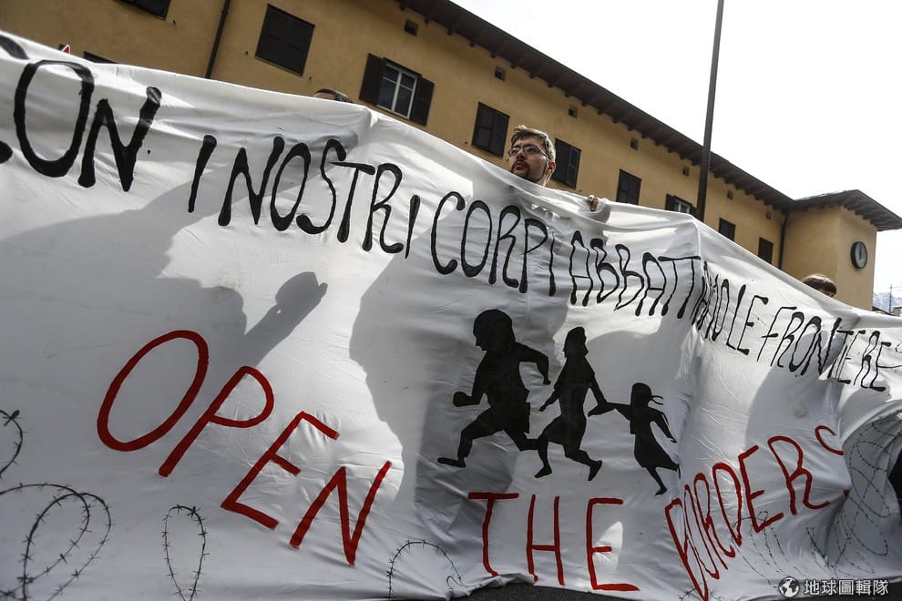 一名示威者拿著標語牌抗議。根據報導,大約 1,500名民眾在 3號時來到奧地利和義大利的邊界,抗議政府封鎖邊界,不讓難民進到奧地利。原本的和平示威最後因為有民眾試圖衝破警方的封鎖線,演變成民眾跟警察之間的衝突,警察用警棍和胡椒噴霧驅離示威者,抗議的人也不甘示弱,朝警察丟瓶子和石頭反擊。