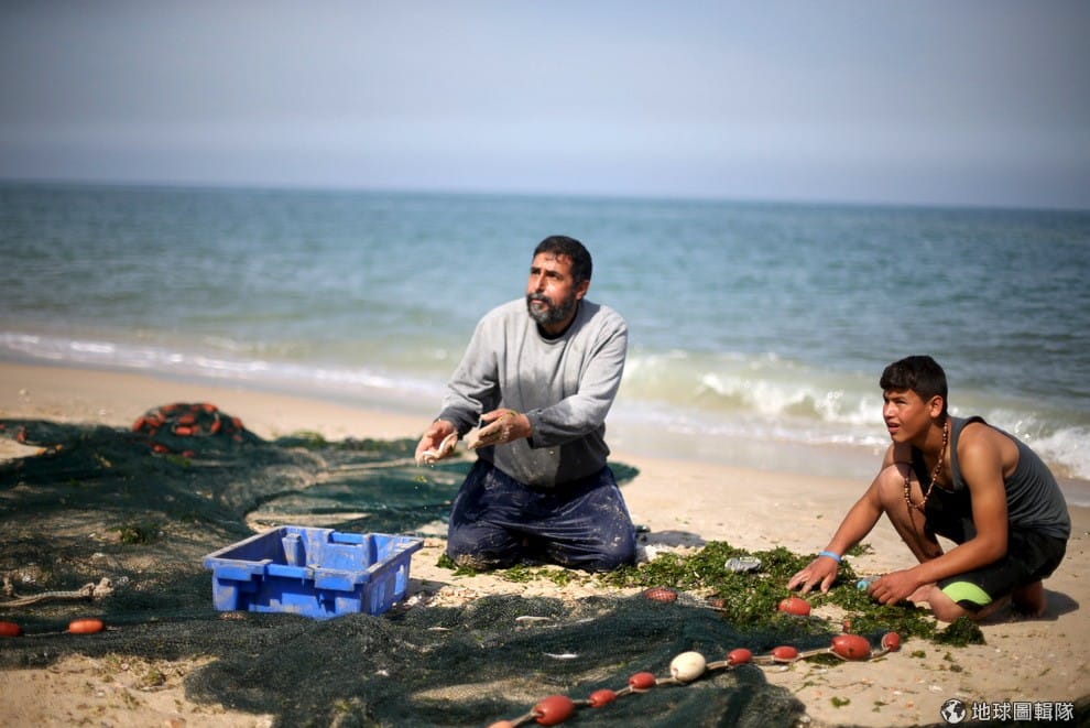 巴勒斯坦漁夫把一隻隻的魚從網子裡拿出來。根據報導,以色列在 3號宣布他們擴大巴勒斯坦人可以捕魚的海域,加薩中南部海岸線一直到海岸往外 16公里處都是巴勒斯坦人允許捕魚的範圍。