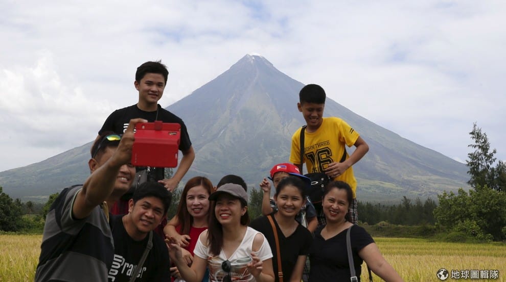觀光客在的菲律賓的馬榮火山前方自拍,根據《維基百科》,馬榮火山是位於菲律賓呂宋島東南部的活火山,它那近乎完美的圓錐形山體,號稱「最完美的圓錐體」,經常被人拿來和日本的富士山相比美,是菲律賓著名的旅遊景點,近來的多次瀕臨噴發,雖然菲律賓政府疏散了附近居民,卻反而吸引了許多欲一睹完美火山爆發景象的火山及攝影愛好者。
