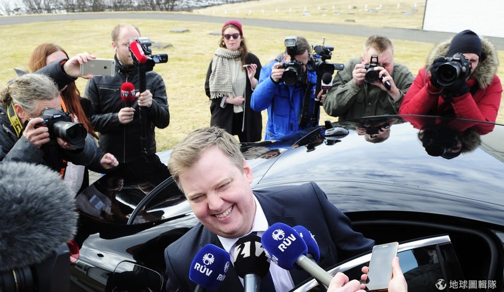 冰島前總理貢勞格松(Sigmundur David Gunnlaugsson)正在對媒體說話,貢勞格松因為「巴拿馬報告」於日前下台。3號的時候,一份超過 1,100萬份文件的報告被國際調查記者聯盟(ICIJ)揭露,這份重量級報告抖出巴拿馬法律事務所莫薩克馮賽卡(Mossack Fonseca)幫全球大人物設立空殼公司逃稅和洗錢的事情,事件延燒至今已經讓冰島總理貢勞格松(Sigmundur David Gunnlaugsson)下台。