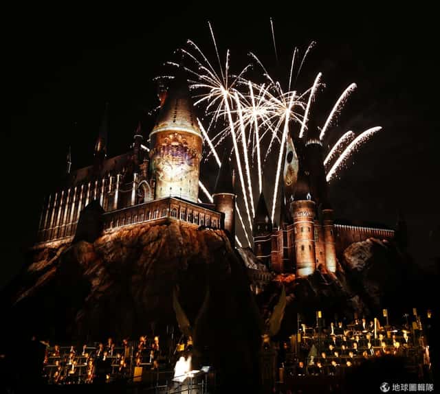 漂亮的煙火在霍格華茲城堡綻放。美國洛杉磯環球影城的「哈利波特樂園」即將在 7號正式開幕,5號這天搶先讓特別來賓和媒體到樂園裡參觀,在電影中飾演哈利波特的演員丹尼爾雷德克里夫(Daniel Jacob Radcliffe)也來到現場共襄盛舉。