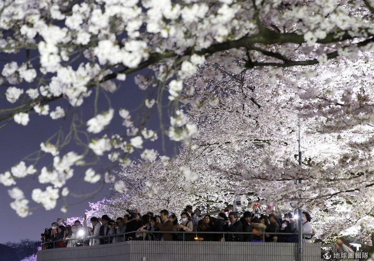 夜晚的櫻花在燈光下散發出柔和的光芒,旅客紛紛拿出相機拍下難得一見的美景。