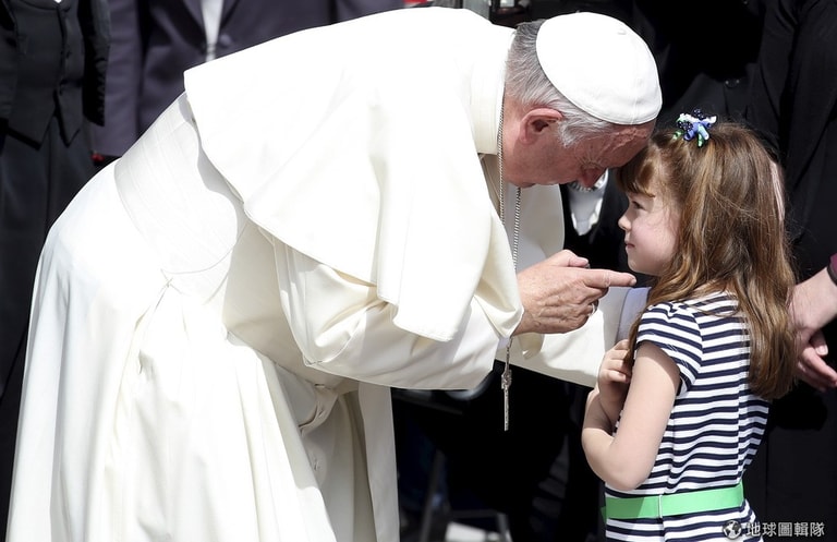 教宗方濟各(Pope Francis)正在對著 5歲的伊莉莎白(Elizabeth 'Lizzy' Myers)說話。伊莉莎白來自美國的俄亥俄州,她得了一種名叫「尤賽氏綜合疾病」(Usher syndrome)的遺傳病,造成她的眼睛失明,耳朵聽力也受損。民眾因為信仰祈求教宗賜福,不過近來卻有人利用這點,製造了大批的「山寨版」教宗商品欺騙信徒。