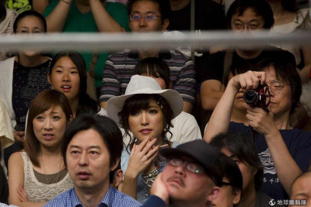 路透社摔角場外,觀眾聚精會神地盯著摔角台上的一舉一動,群眾中不乏女性,一旁也不時有人拿起相機記錄賽況。