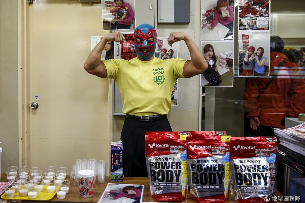 路透社場內一名在賣高蛋白食品的男子,戴上摔角選手的面具朝鏡頭展現自己的肌肉。