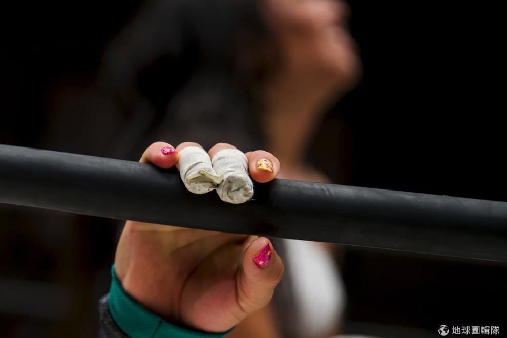 路透社一名女子摔角選手將手放在摔角台上的彈力結界,仔細看她的手纏著護帶,有的指頭則塗上鮮艷的指甲油。
