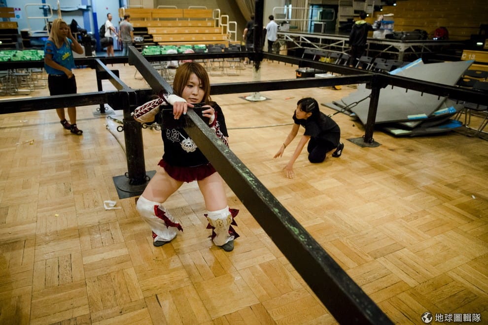 路透社一名女子摔角選手正在幫忙架設摔角台,每個環節都要小心才能帶給觀眾一場精采的比賽。