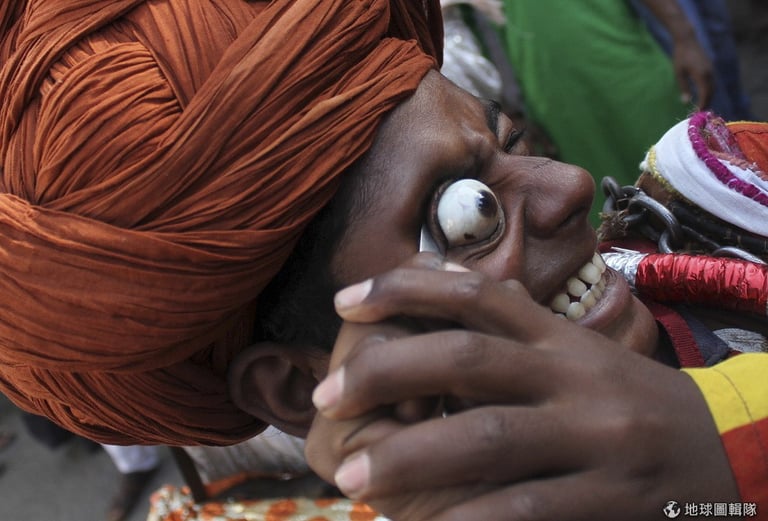 一位穆斯林在遊行的時候,表演特技。印度阿傑梅爾(Ajmer)市舉辦連續 6天的「烏爾斯節」(Urs festival),紀念伊斯蘭教蘇菲派的聖人奇斯提(Khwaja Moinuddin Chishti)。