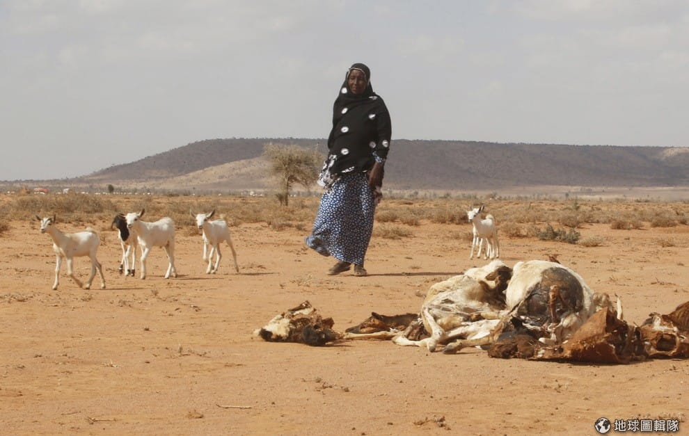 女人趕著山羊、綿羊經過死去的動物,「聖嬰現象」(El Nino)引起的乾旱襲捲了索馬利亞的北邊小鎮,造成大量的動物死亡。