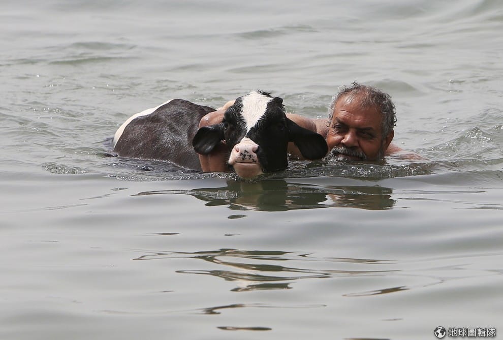 男人跟著一隻小牛,在黎巴嫩南部的習登(Sidon)港都游泳。