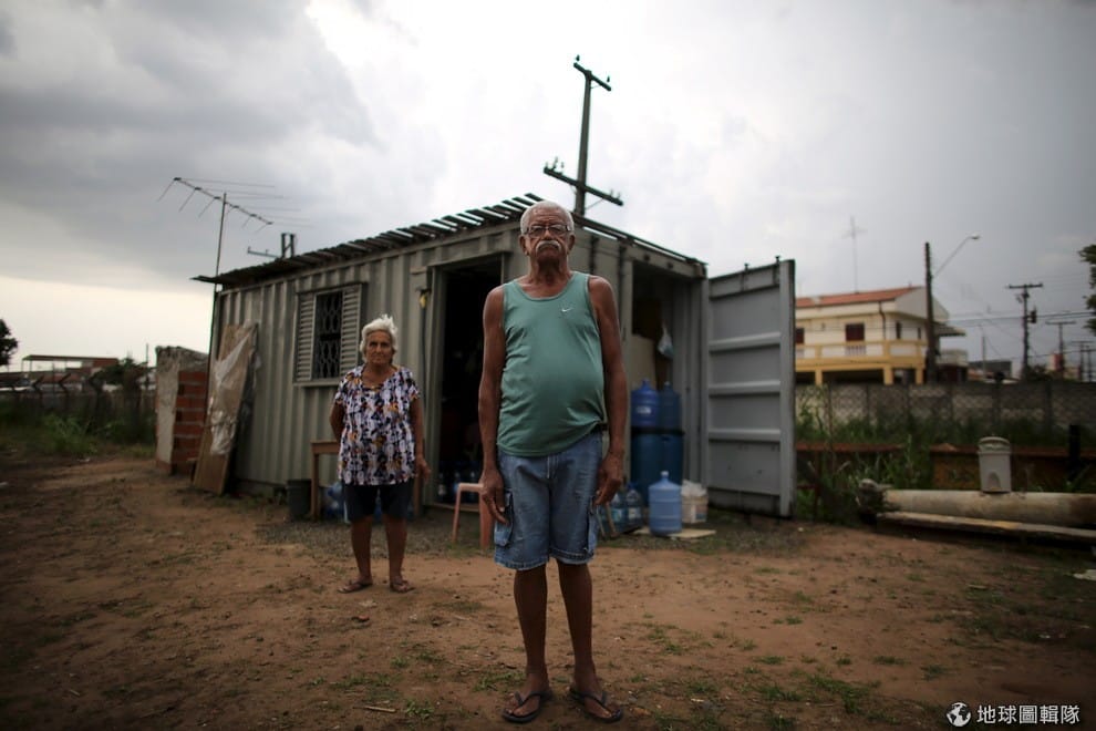 75歲的喬斯(右,Jose Pereira)和 71歲的克勞蒂亞(Claudia Rodrigues),站在他們的貨櫃屋前面。喬斯是一名退休的廚師,克勞蒂亞則是退休的清潔人員,住在一起長達 42年的他們因為負擔不起房租,從今年 1月開始搬到貨櫃裡住。他們每個月領到的養老金大約是 1,600雷亞爾(折台幣約 14,008元),其中有 380雷亞爾(折台幣約 3,326元)需要拿來作為醫療費。