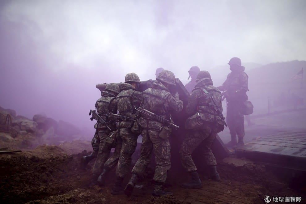 南韓軍人在美韓的聯合演習中,搬運著浮橋。