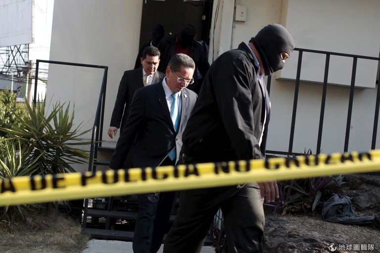 薩爾瓦多的檢察總長梅南德茲(中,Douglas Melendez)走出法律事務所,他們在 8號時突襲巴拿馬法律事務所「莫薩克馮賽卡」(Mossack Fonseca)在薩爾瓦多的分部,扣押了事務所的文件還有設備。