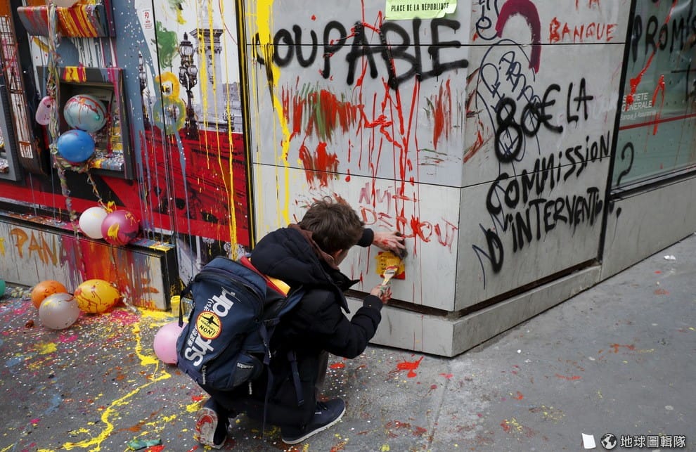 一名參加「夜之起義」(Nuit Debout)行動的人,在牆壁上貼東西。8號這天晚上,好幾千人盤腿坐在巴黎的共和國廣場,輪流拿麥克風抗議他們不滿的社會現象,主題從逃稅、Google的主導控制地位到住宅不公都有。夜之起義已經持續了 1個禮拜,這場夜晚的活動每天都持續到清晨示威者被警方趕走的時候,到了晚上,示威者又會再次回到廣場上聚集。