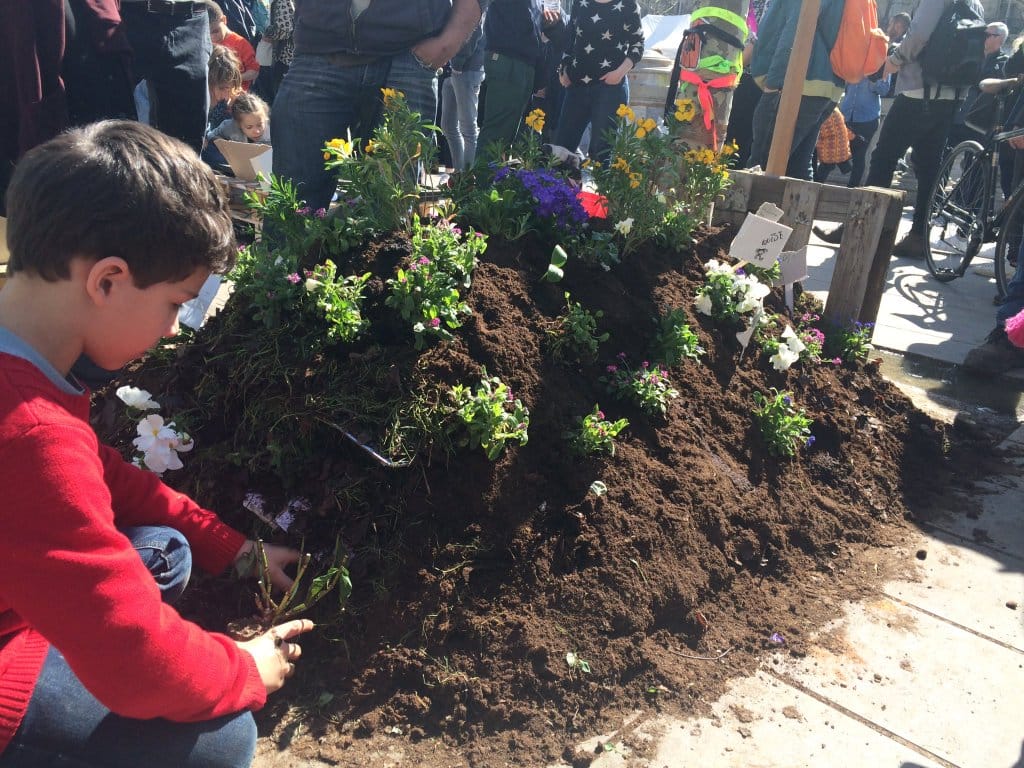 小朋友在「夜之起義」示威現場在種綠色植物。