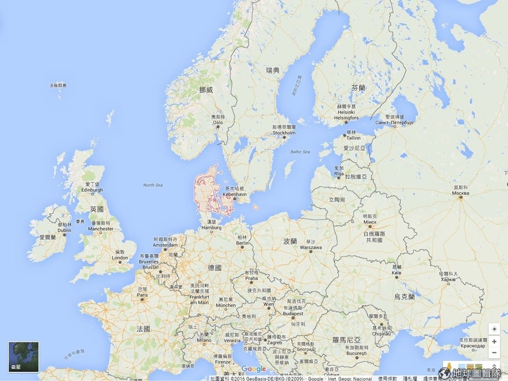 丹麥面積 43,094平方公里,只比 36,193平方公里的台灣大一些。上圖的紅色區域就是丹麥。