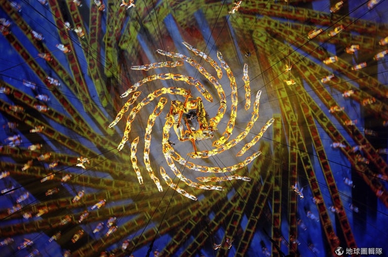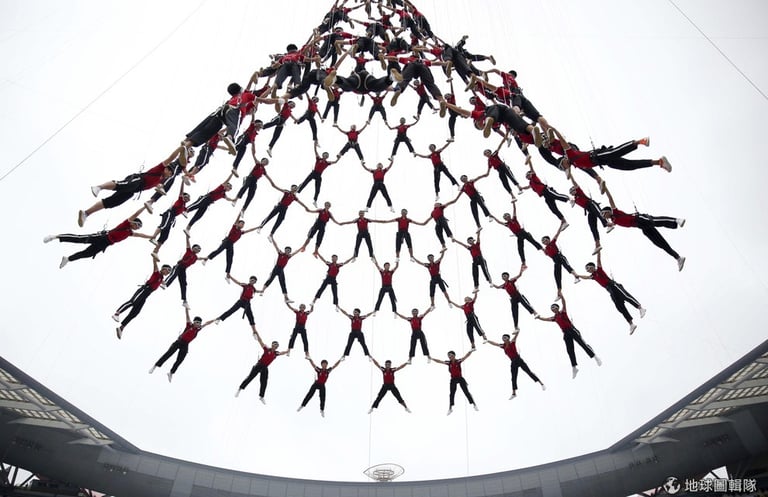 2014年時,南京市體育館中,可見學生們身上繫著鋼索準備排出各種令人咋舌的圖樣。他們為了南京青年奧運會開幕式表演準備中。