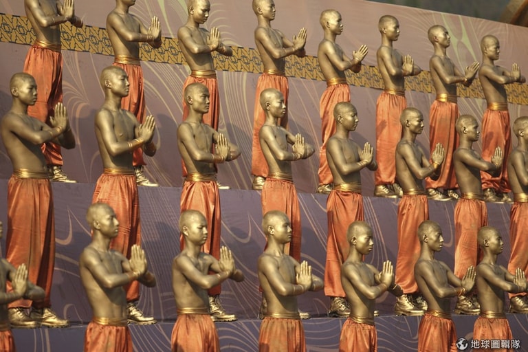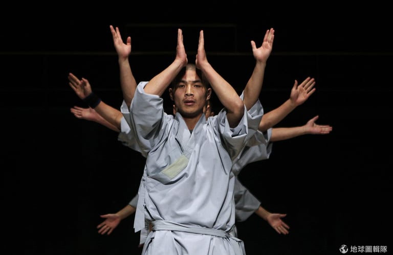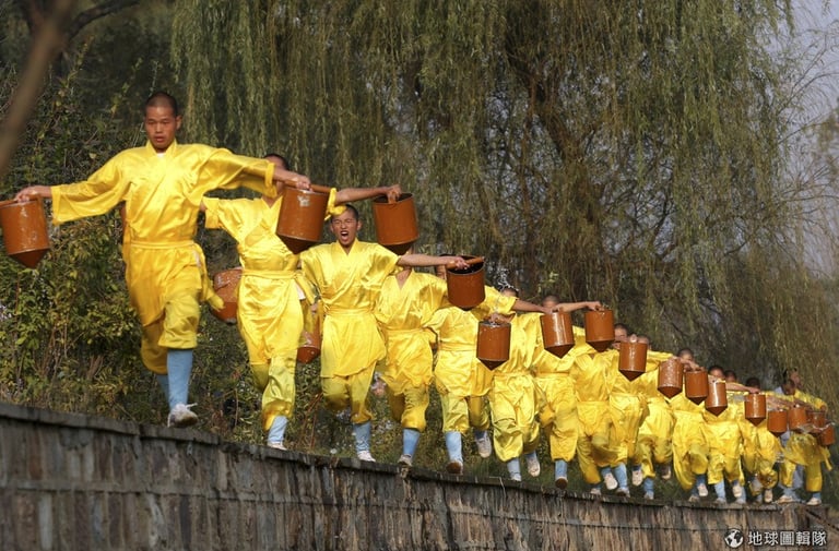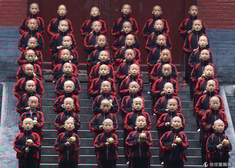 年輕的學生們拿著木魚彩排。《維基百科》中談到,少林功夫從少林寺創建開始就逐漸形成,少林寺在文化意義上已超脫佛寺建築藝術本身,禪學、意念(心靈)、藝術、醫學都包含在其中,而少林武術又是當中最具代表的一個鮮明符號。