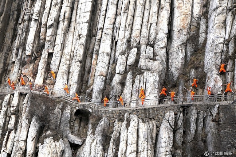 正在嵩山懸崖邊進行武術訓練的學生們。