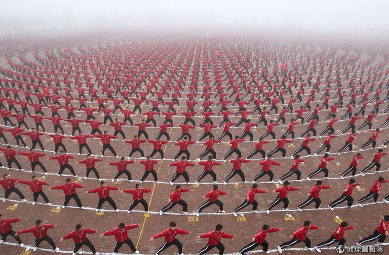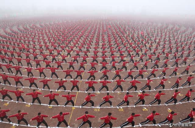 表演武術的學生們整齊劃一地動作,他們正歡慶少林武術節。中國鄭州國際少林武術節創辦於 1991年,宗旨為「以武會友,共同進步」。