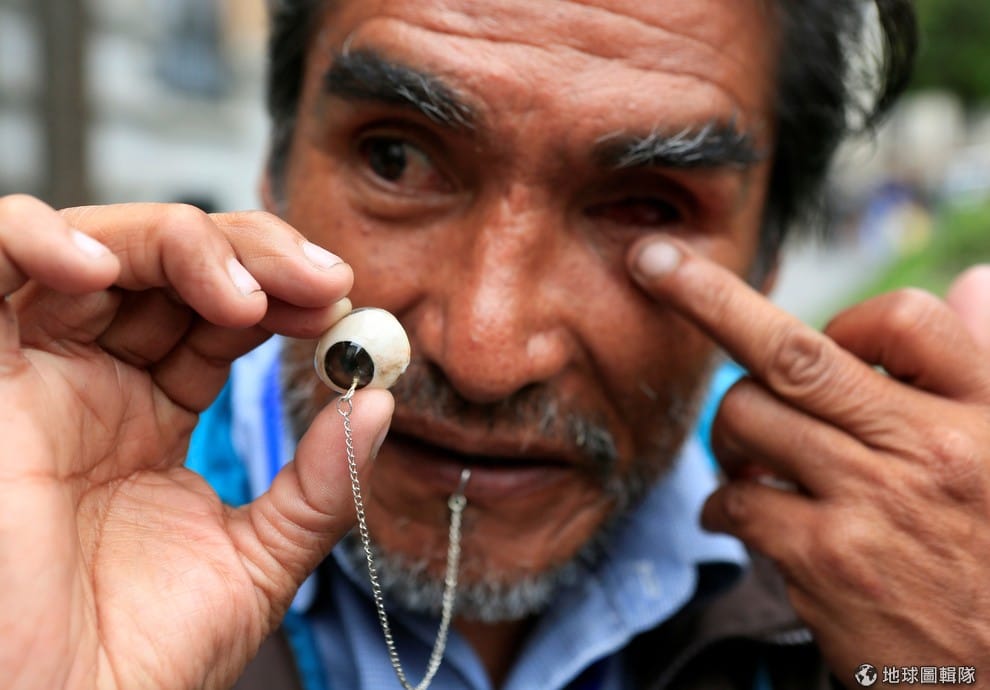 一名男子將義眼從眼眶中取出,他和其他身障人士一起上街遊行,希望政府可以將他們的身障補助調整至每月 70美元(折台幣約 2,281元),讓他們可以維持正常生活。