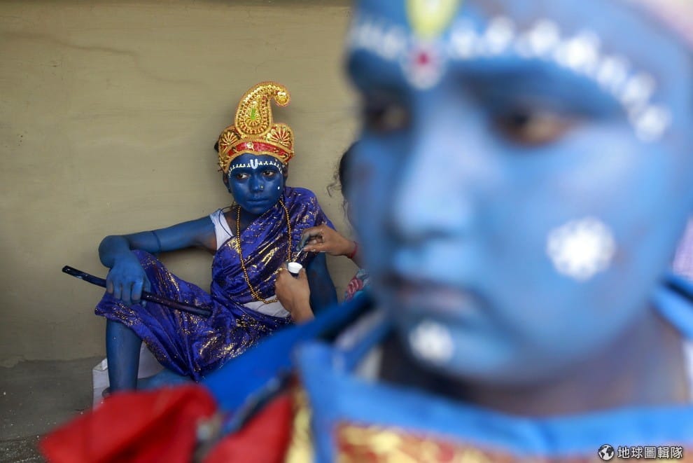 時值當地賈函節(Gajan Festival)熱鬧登場,一名女孩任由化妝師將藍色的油彩塗上身,準備待會上台表演。賈函節是印度東部西孟加拉省的重頭戲,而「賈函」意指「村民」,這一天村民們都會參加表演討濕婆神的歡心,希望藉此讓自己心想事成。