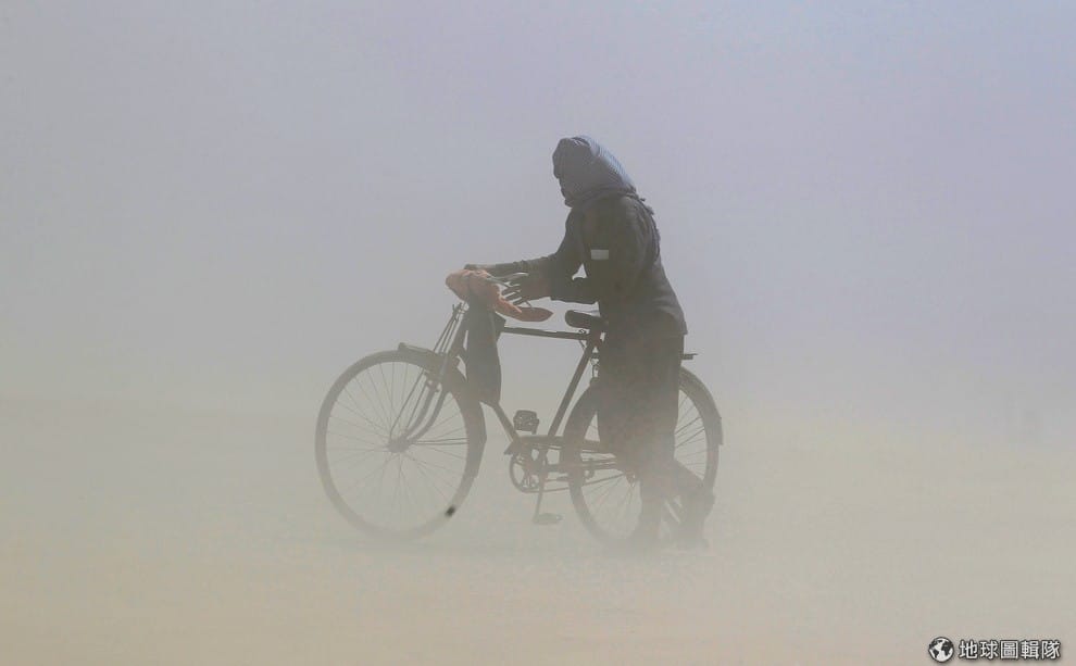 在恆河沿岸,一名男子將臉部牢牢包住,推著腳踏車走在沙塵暴中。對印度人而言,恆河是他們心目中的聖河,不少人沐浴、洗衣等日常生活大小事都在河裡,人們認為恆河可以幫他們洗清一身的罪惡,死後火化的骨灰被灑在恆河可以超脫生死輪迴,遠離痛苦。