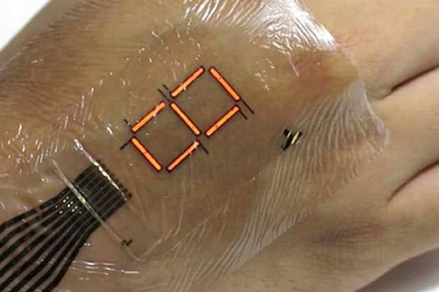 此外,研究人員還在電子皮膚內安裝了綠色和紅色的高分子有機發光二極體(PLED),如此一來可以有效顯示人體血氧量,醫護人員再也不需要用笨重的測量儀器掌握患者的狀況。染谷隆夫教授說:「電子皮膚不只不用讓人隨身攜帶測量儀器,它還能加強我們與周遭的互動或是為人類的溝通開啟新的一頁。」