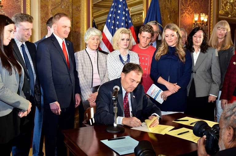 猶他州州長赫伯特在眾人的圍繞下,簽署法案。