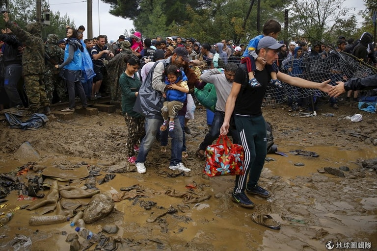 從希臘邊境進入馬其頓的難民們,互相幫助踩過泥濘地。Photo Credit: Yannis Behrakis