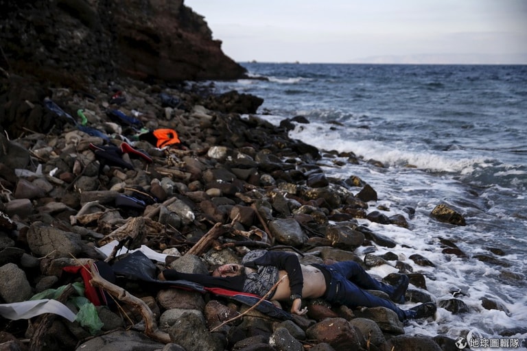列斯伏斯島(Lesbos)岸邊,難民的遺體倒在石岸上。 Photo Credit: Alkis Konstantinidis