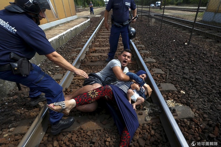 躺在鐵軌上的難民激動拒絕被匈牙利警察帶走。匈牙利政府對難民現象不心軟,他們曾在 2015年時表示要築高牆防止難民湧入。Photo Credit: Laszlo Balogh