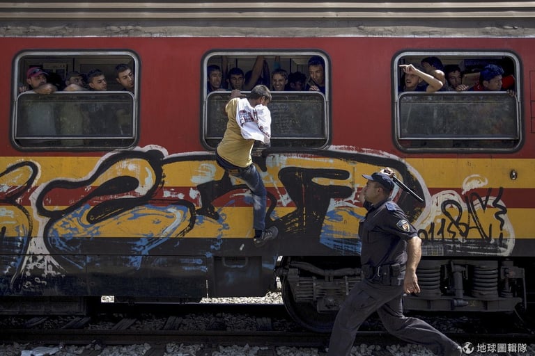 馬其頓警方揮著警棍,阻止難民攀上擠滿人的火車。Photo Credit: Stoyan Nenov