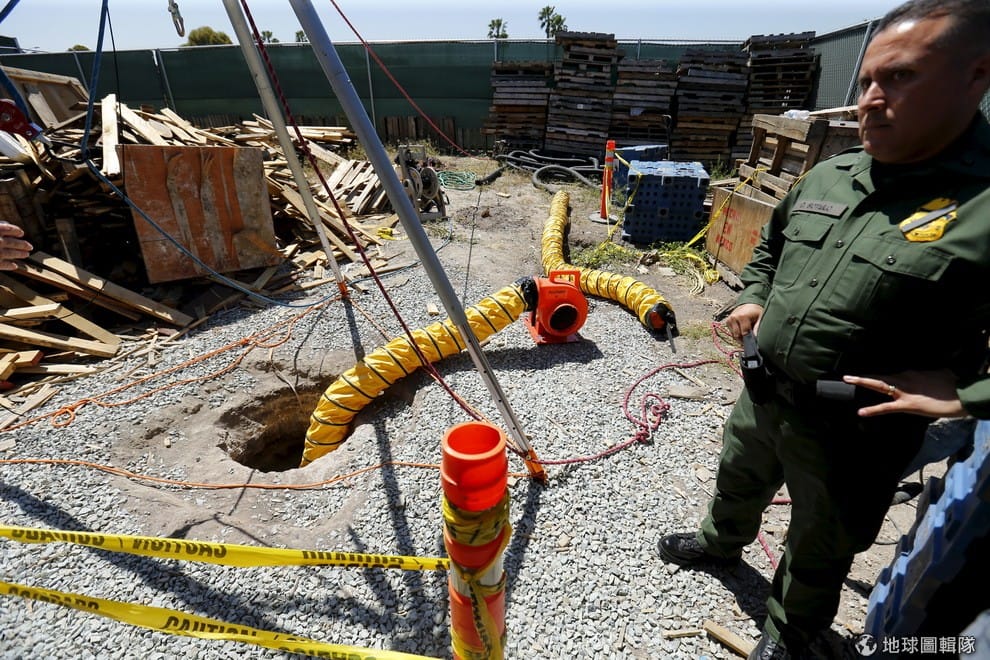 美國邊界巡邏警察站在一條地道旁,這條地道從墨西哥的提華納市一路通往加州聖地牙哥市,美警害怕有墨西哥偷渡客靠著這條地道潛入美國。