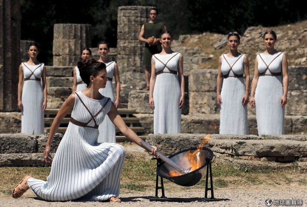 一名希臘女演員穿著飄逸的長裙,利用拋物面反射鏡聚集陽光後,點燃手上的火把,她正在為 2016里約奧運的點燃聖火儀式彩排。