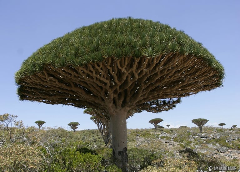 上圖是珍貴的索科特拉龍血樹(Dragon's Blood trees),它們的外觀很獨特及奇怪,就像是倒轉的雨傘,這種樹型可以幫助它們渡過乾旱季節,是索科特拉島上特有的一種龍血樹屬植物,古時相信他們的樹脂是龍的血液,所以也有用在魔法及煉金術中。